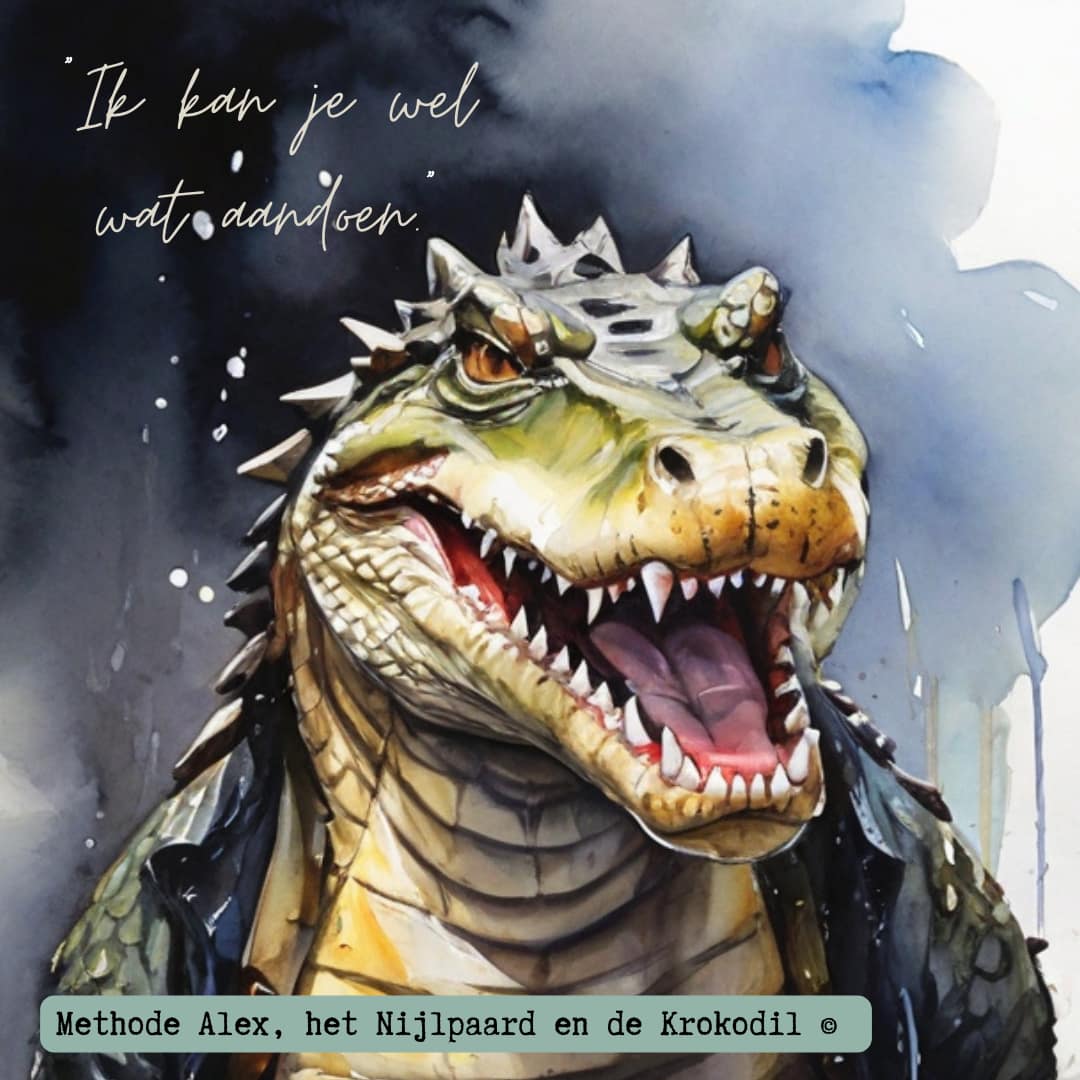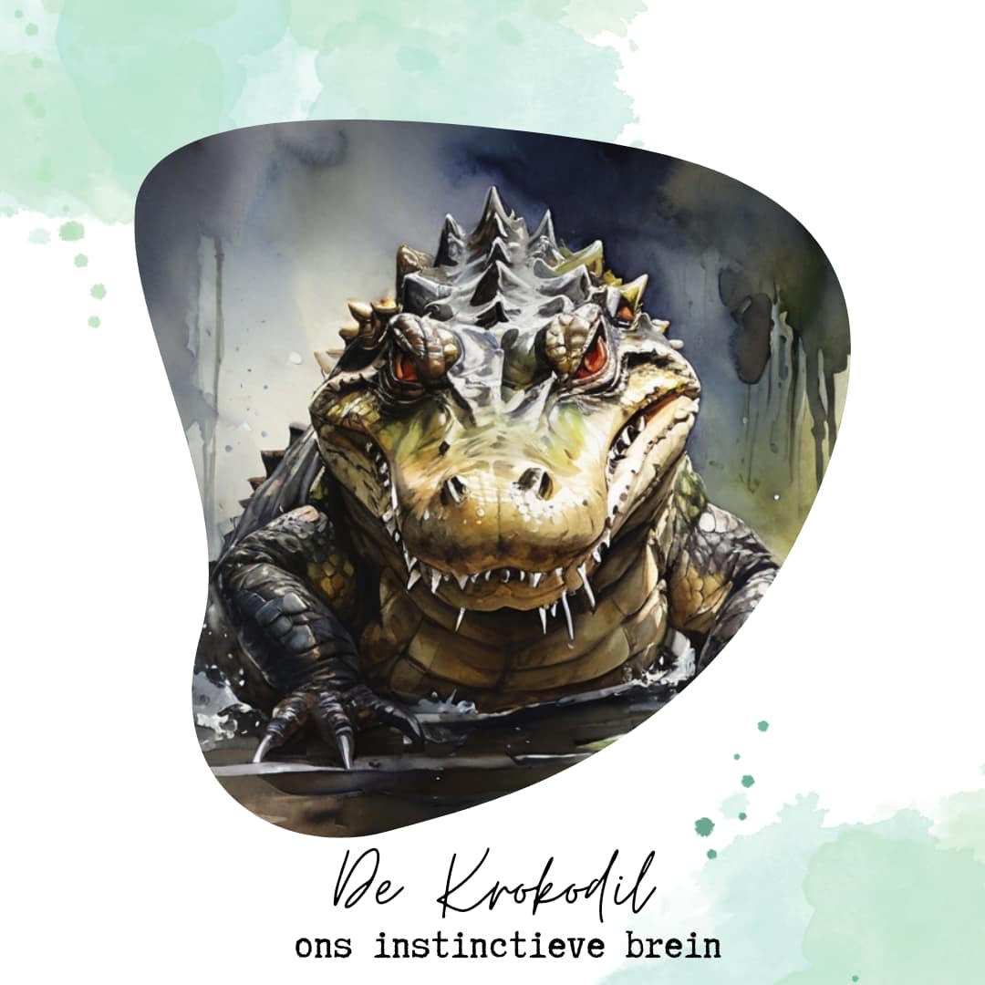 De krokodil heeft een platte kop. Weinig ruimte voor hersenen. De krokodil heeft geen ruimte om te denken en te voelen. Hij ligt stil in het water wachtend op een moment waarop hij moet reageren. Vechten, vluchten of bevriezen? De ene keer vecht hij er op los en de andere keer vlucht hij er vandoor. Super handig als er echt gevaar dreigt. De krokodil komt echter ook vaak helpen als Alex denkt dat er gevaar is, terwijl dat er eigenlijk niet is.